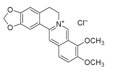 2、一种生物碱,带有弱的抗生素特性,细菌多重耐药外排泵(MDR efflux pumps)的底物。 berberine的抗微生物活性可被MDR抑制剂5′-methoxyhydnocarpin (5′-MHC)强化。Berberine调控肝癌细胞Pgp基因的表达。