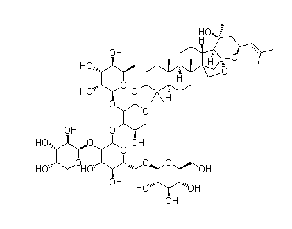 别名 酸枣仁皂苷 A ;酸枣仁皂甙A ;O-6-Deoxy-a-L-mannopyranosyl-(1(r)2)-O-[O-b-D-glucopyranosyl-(1(r)6)-O-[b-D-xylopyranosyl-(1(r)2)]-b-D-glucopyranosyl-(1(r)3)]-(3b,16b,23R)-16,23:16,30-diepoxy-20-hydroxydammar-24-en-3-yl-a-L-arabinopyranoside
