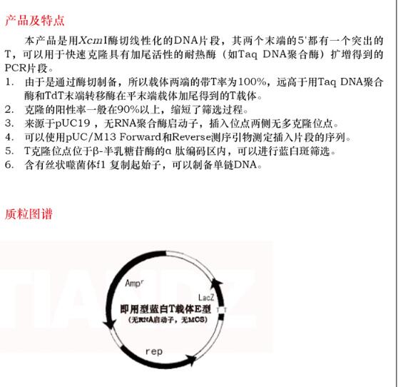即用型蓝白 T 载体 E 型 ( 无启动子,无 MCS)20 次