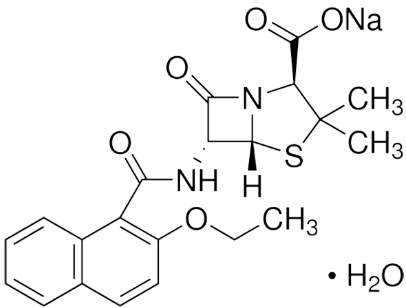 别名萘夫西林钠; (2S,5R,6R)-6-[(2-乙氧基萘-1-甲酰)氨基]-3,3-二甲基-7-氧代-4-硫杂-1-氮杂双环[3.2.0]庚烷-2-甲酸钠盐一水合物;Sodium (2S,5R,6R)-6-[(2-ethoxynaphthalene-1-carbonyl)amino]-3,3-dimethyl-7-oxo-4-thia-1-azabicyclo[3.2.0]heptane-2-carboxylate hydrate; Nafcillin sodium monohydrate